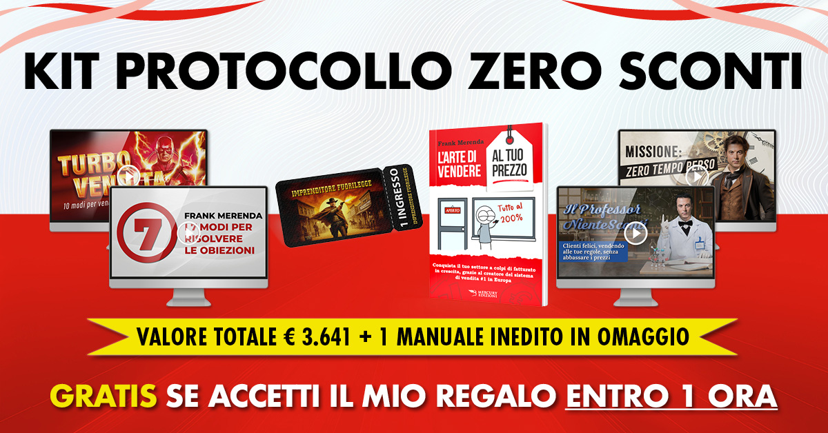 GRATIS per te il kit Protocollo Zero Sconti: oltre 300 minuti di formazione vendita + un manuale inedito, mai visto prima, per smetterla di perdere tempo con clienti inconcludenti attratti soltanto da sconti e promozioni!